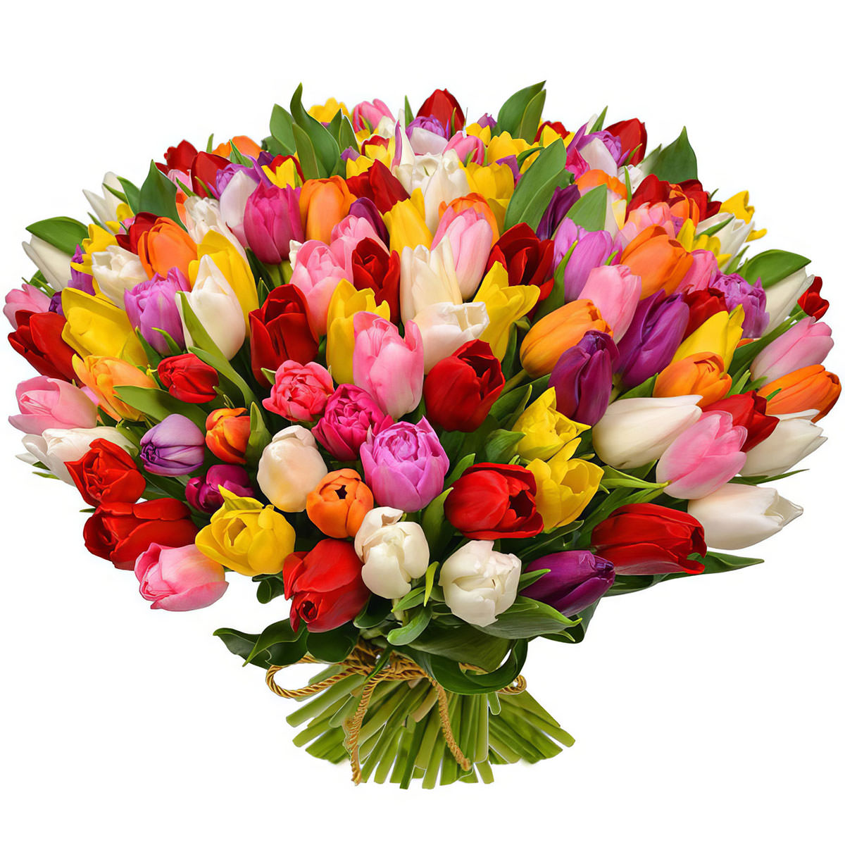 Акция! Тюльпаны 101 шт. — это великолепное сочетание цветов, в котором каждый компонент поддерживает и усиливает другой. Цветочная композиция впечатляет своим разнообразием, гармония которого создает уникальную атмосферу.