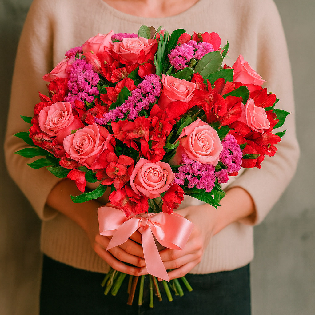 Розовые розы, красные альстромерии и сиреневая статица создают гармоничную композицию, дополненную свежей зеленью. Букет перевязан атласной лентой, что придаёт ему изысканность. Возможны варианты упаковки в матовую плёнку или крафт-бумагу. Прекрасный выбор для любимой на день рождения или годовщину.