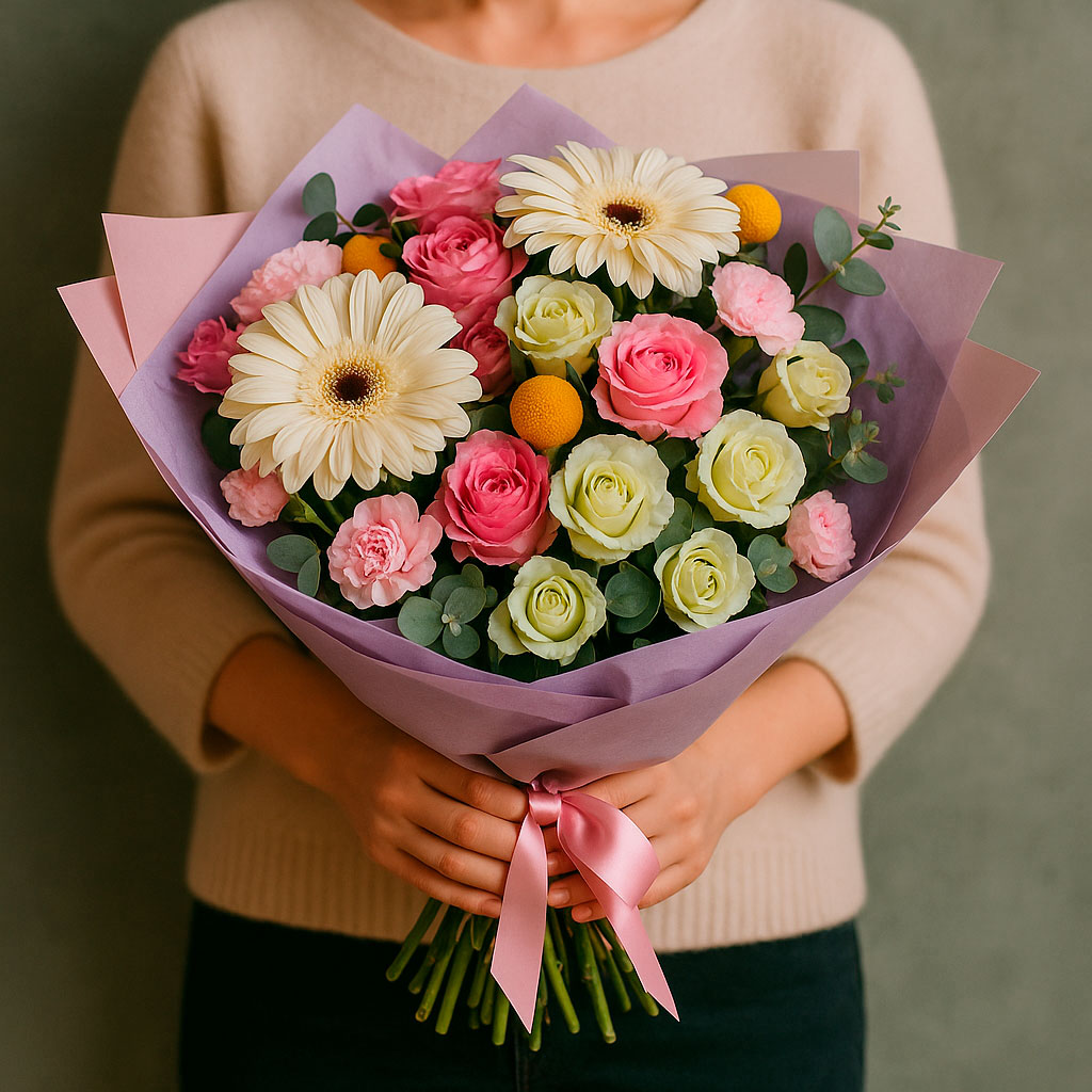 Белоснежные герберы и кустовые розы в нежных оттенках розового и белого создают атмосферу лёгкости и свежести. Эвкалипт и жёлтые хризантемы добавляют яркие акценты. Упакован в матовую плёнку с атласной лентой. Возможны варианты с крафт-бумагой или декоративной сеткой. Прекрасный выбор для любимой на день рождения.