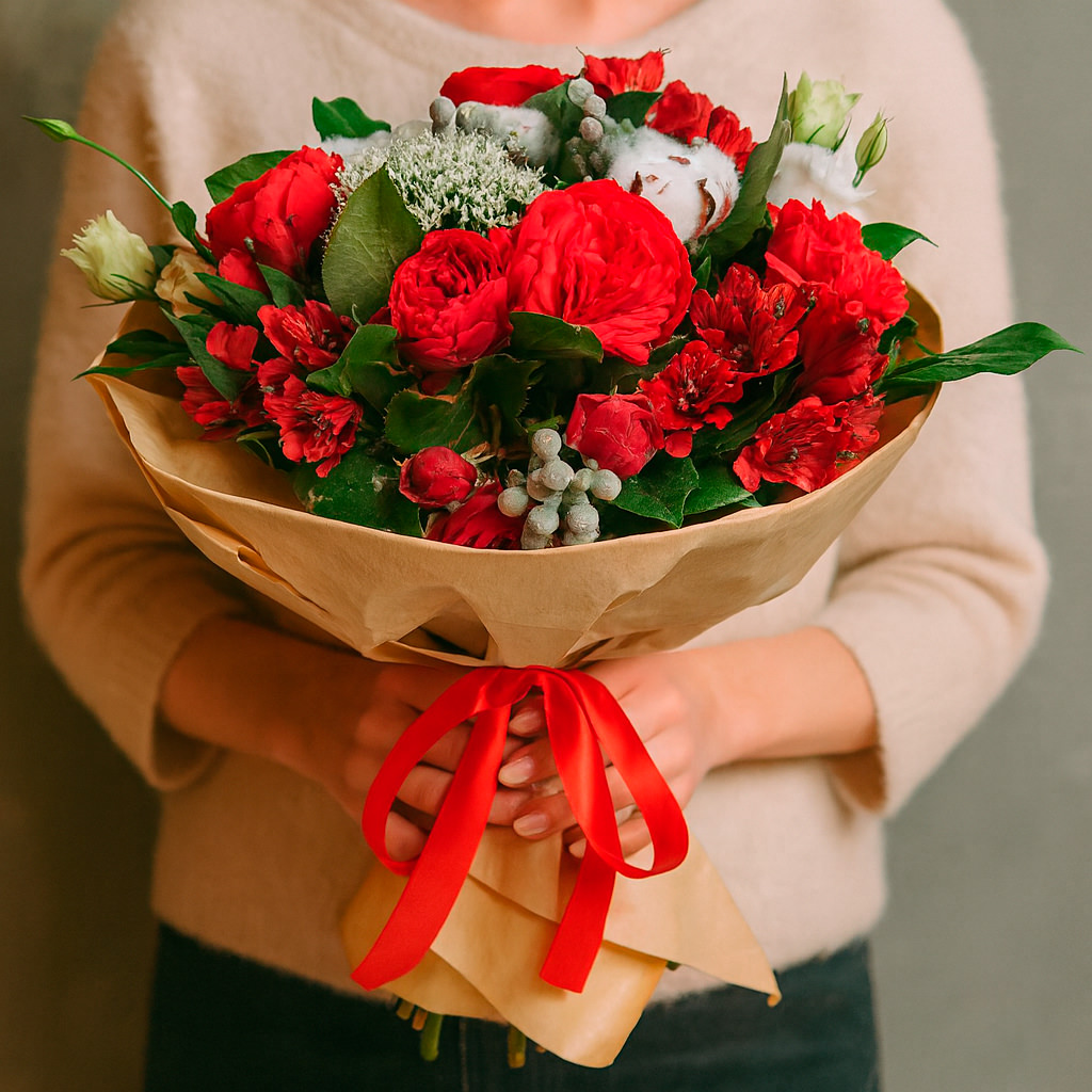 Яркие красные пионовидные розы и альстромерии создают насыщенную композицию, дополненную белоснежной эустомой и хлопком. Бруния придаёт букету изысканность и текстуру. Упакован в крафт-бумагу с красной лентой, что подчёркивает его элегантность. Возможны варианты упаковки с матовой плёнкой или декоративной сеткой. Прекрасный выбор для подарка на день рождения или для любимой.