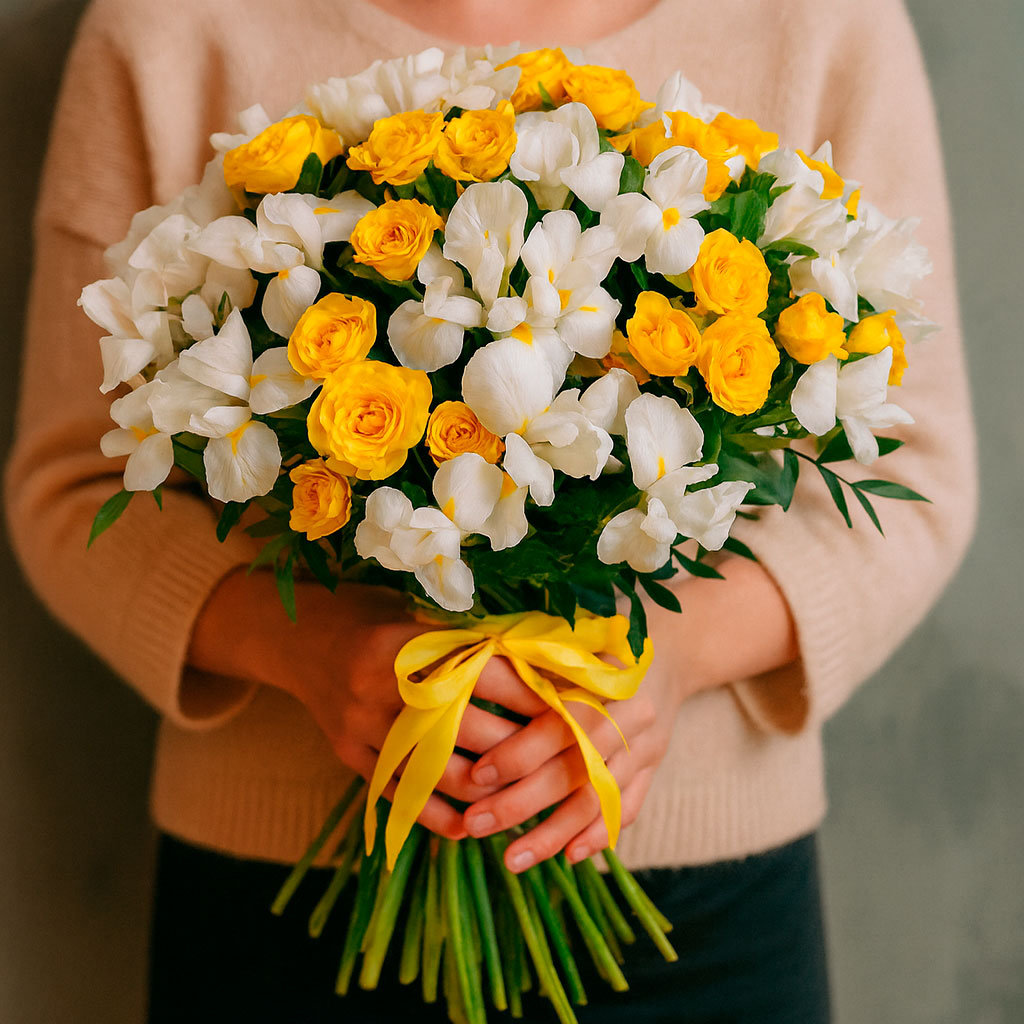 Яркий букет из белых ирисов и жёлтых кустовых роз, дополненный фисташкой, создаёт атмосферу свежести и радости. Букет перевязан жёлтой лентой, что подчёркивает его солнечное настроение. Возможны альтернативы упаковки: матовая плёнка или крафт-бумага. Подойдёт для поздравления на день рождения или для любимой.