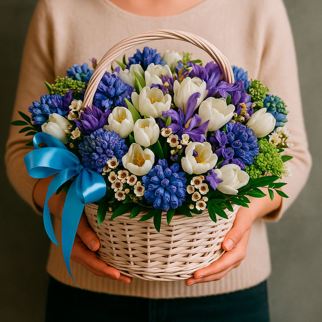 Элегантная композиция из белых тюльпанов, синих гиацинтов, нежных ромашек и васильков, дополненная зеленью, создает атмосферу утренней свежести. Корзина выполнена из плетёного материала и украшена голубой лентой. Возможны варианты оформления в корзине из лозы или с тканевой отделкой. Прекрасный подарок для любимой на 8 марта или для мамы на День матери.