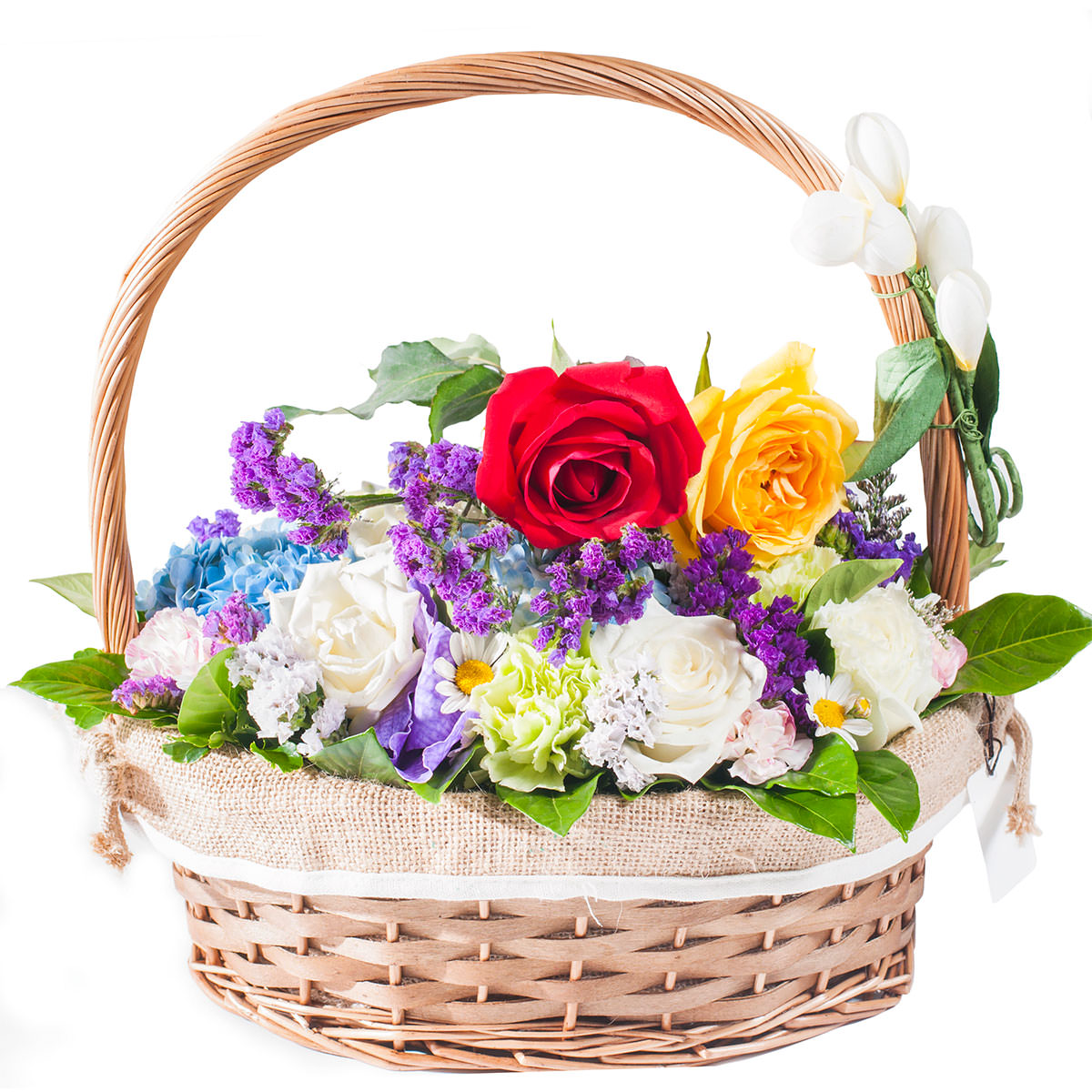 Эта корзина с цветами сочетает в себе красные, белые и жёлтые розы, голубую гортензию, нежные ромашки и жёлтые гвоздики, дополненные статицей. Плетёная корзина с тканевой отделкой подчёркивает естественную красоту композиции. Возможны альтернативы оформления: корзина из лозы или ротанга. Прекрасный подарок для любимой на годовщину или свадьбу.