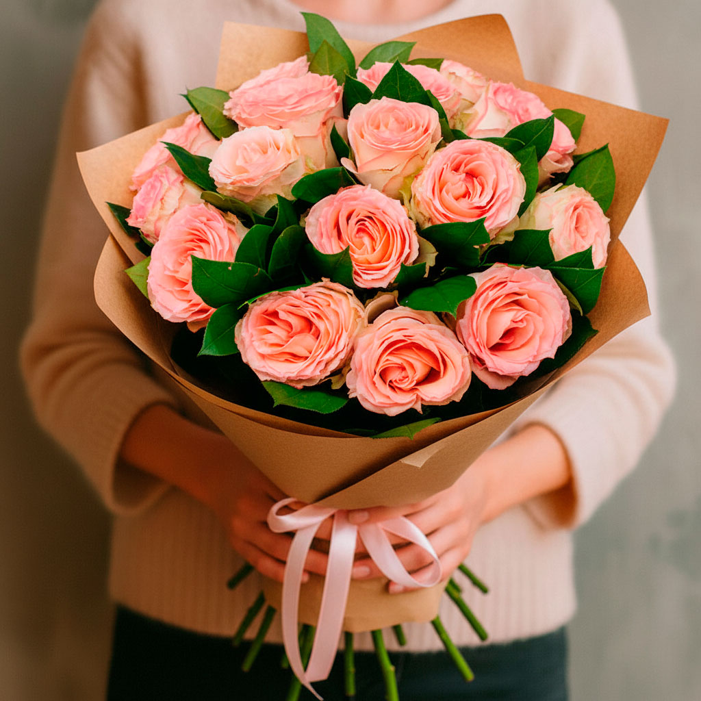 Персиковые пионовидные розы, обрамлённые свежей зеленью, создают нежный и романтичный образ. Букет перевязан изящной лентой и упакован в крафт-бумагу, что подчёркивает его естественную красоту. Возможны альтернативы оформления с матовой плёнкой или декоративной сеткой. Прекрасный выбор для любимой на день рождения или годовщину.