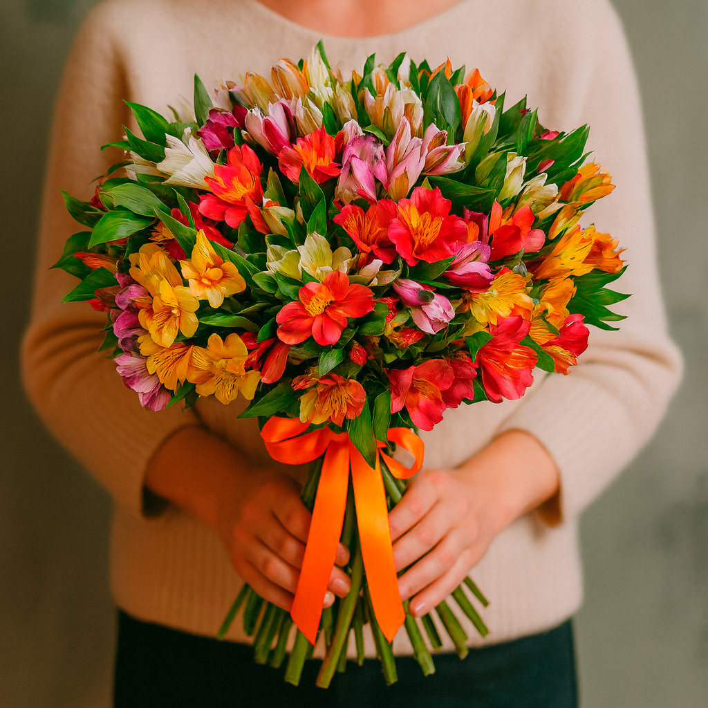 Яркие альстромерии в белых, жёлтых, красных и сиреневых оттенках создают живописную композицию. Перевязан оранжевой лентой, подчёркивающей насыщенность цветов. Возможна упаковка в крафт-бумагу или декоративную сетку. Прекрасный выбор для поздравления с днём рождения или для любимой.