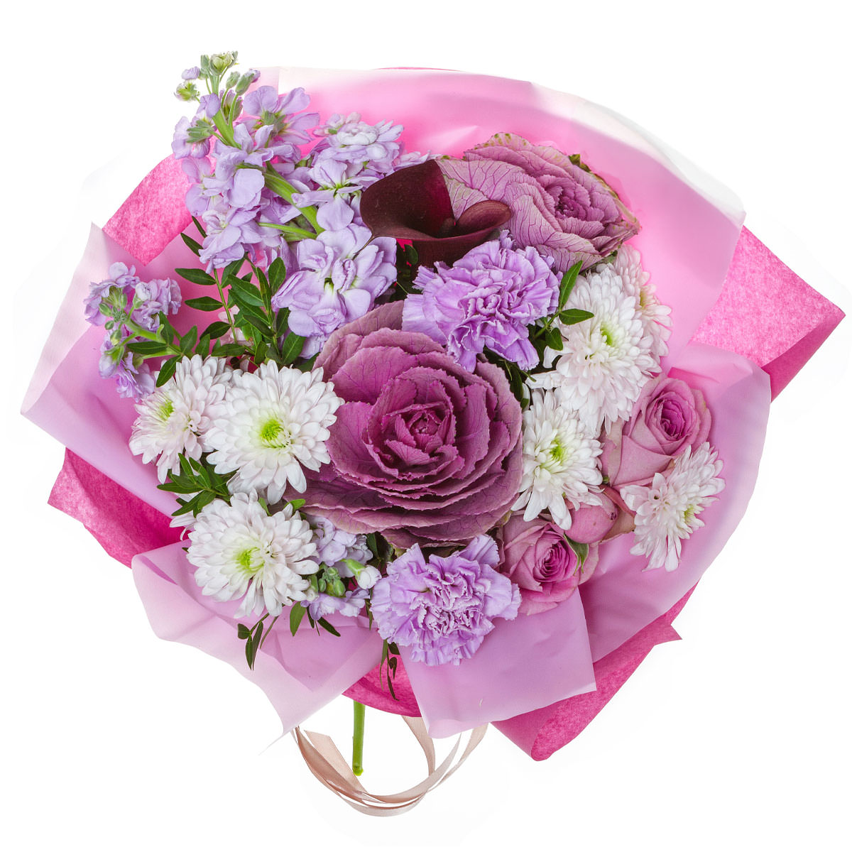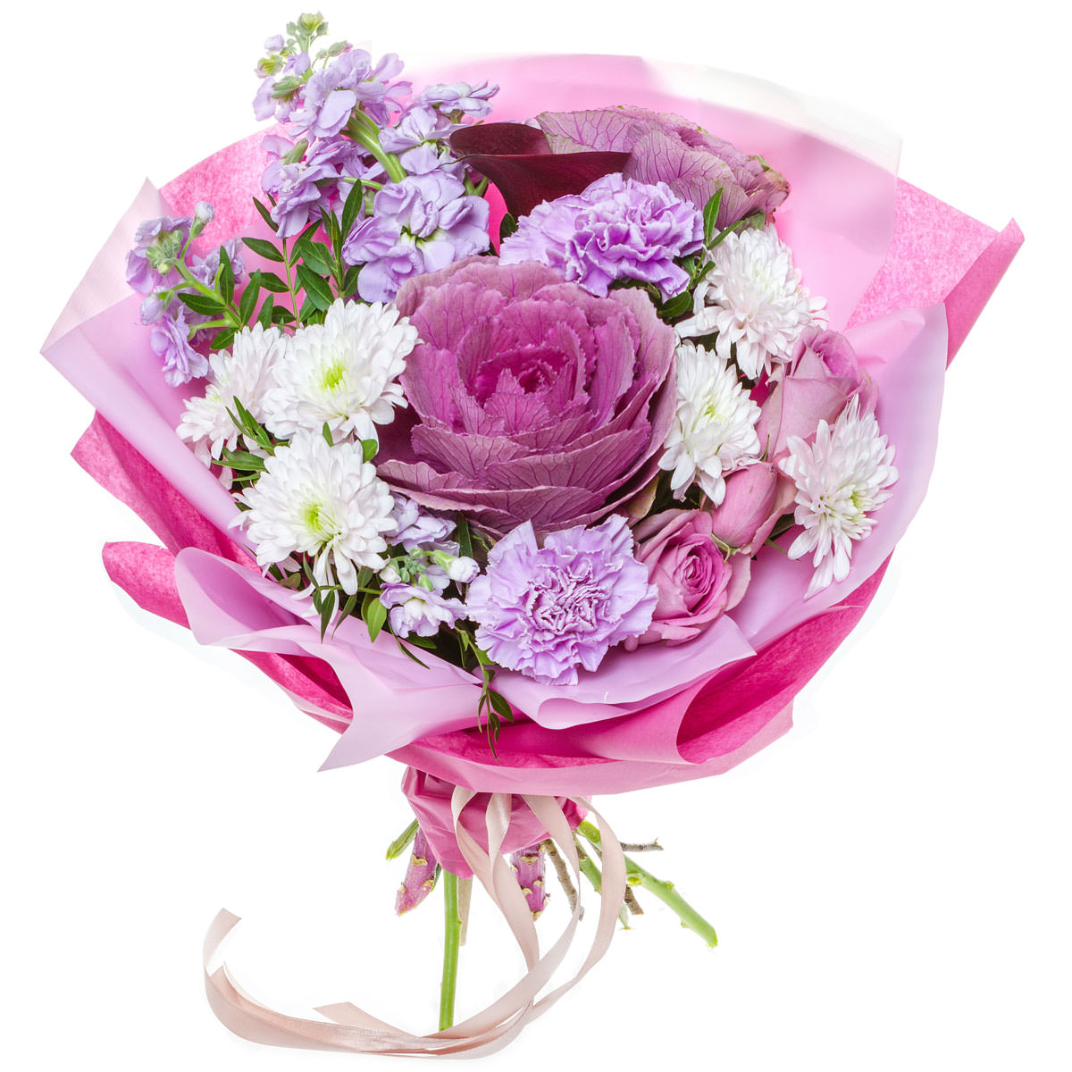 Маттиола сиреневая, брассика, фиолетовая гвоздика, белая кустовая хризантема и розовая одноголовая роза создают гармоничную цветочную симфонию. Букет оформлен в розовую матовую пленку и перевязан атласной лентой. Возможны альтернативы оформления: крафт-бумага или декоративная сетка. Прекрасный подарок для любимой на годовщину или для мамы на день рождения.