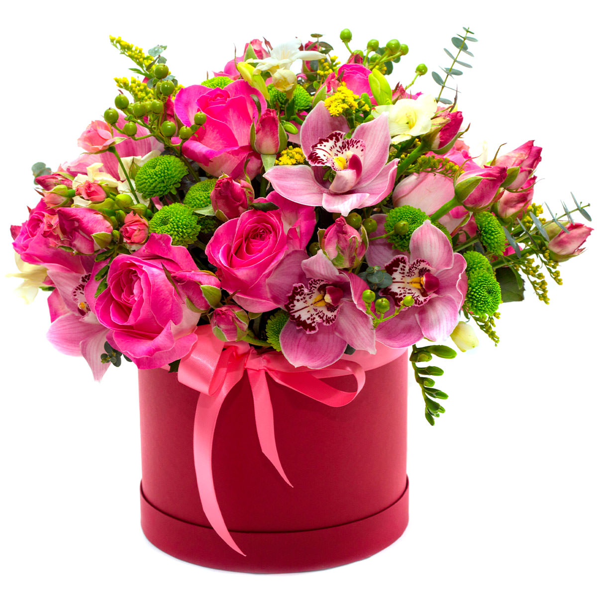 Роскошная композиция из розовых орхидей и роз, дополненная белыми фрезиями и зелёной хризантемой, создаёт атмосферу нежности и утончённости. Яркие акценты гиперикума и солидаго гармонично сочетаются с эвкалиптом, придавая букету свежесть. Упакован в элегантную шляпную коробку насыщенного красного цвета с розовой лентой. Возможны варианты оформления в бархатной или атласной коробке. Прекрасный подарок для любимой на годовщину или день рождения.