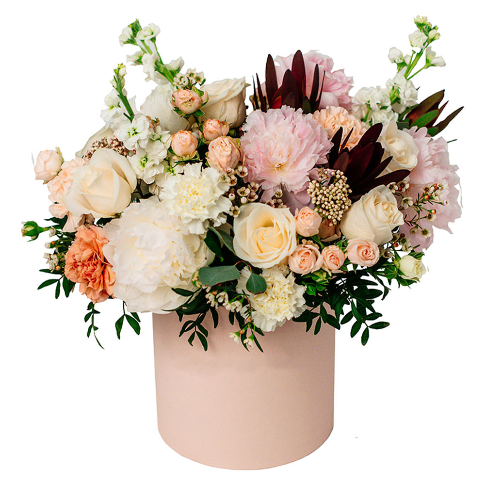 Кремовые розы и кустовые розы, белая маттиола и розовый пион создают изысканную композицию, дополненную хамелациумом и кремовой гвоздикой. Леукодендрон, фисташка и эвкалипт придают букету свежесть и объем. Композиция оформлена в элегантной шляпной коробке нежного розового цвета. Возможны варианты оформления в бархатной или дизайнерской коробке. Прекрасный подарок для любимой на годовщину или день рождения.