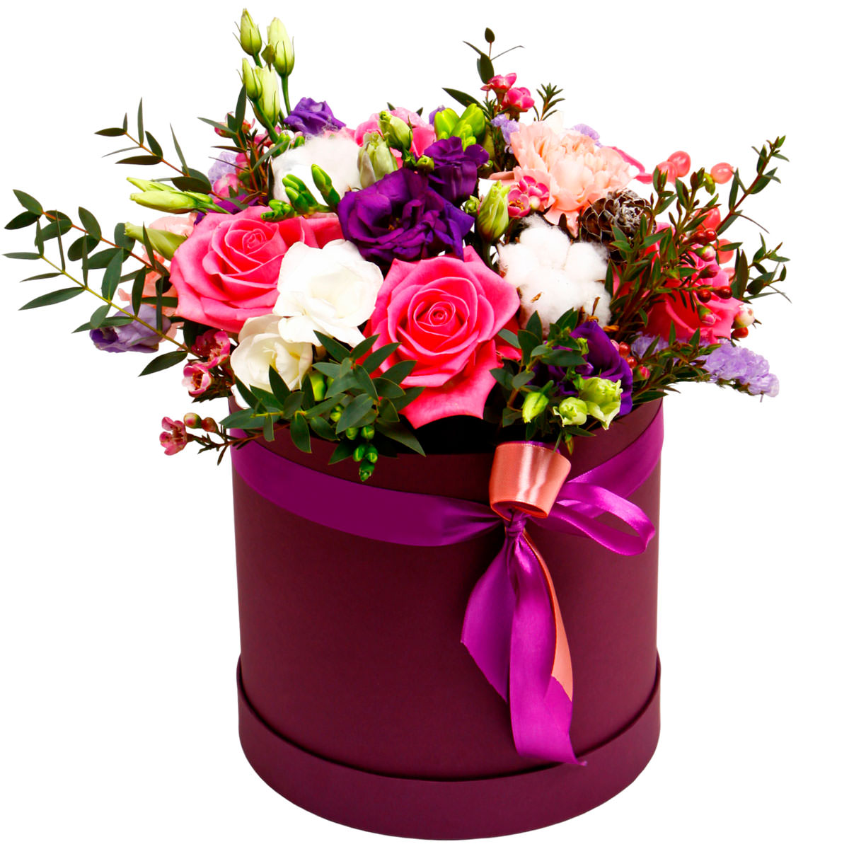 Розовые одноголовые розы, фиолетовые эустомы и белые фрезии создают гармоничную композицию, дополненную розовым ваксфлауэром, хлопком и сиреневой статицей. Гиперикум и зелень придают букету свежесть и объем. Композиция оформлена в элегантной шляпной коробке бордового цвета с атласной лентой. Возможны альтернативы оформления в бархатной или дизайнерской коробке. Прекрасный подарок для любимой на годовщину или день рождения.