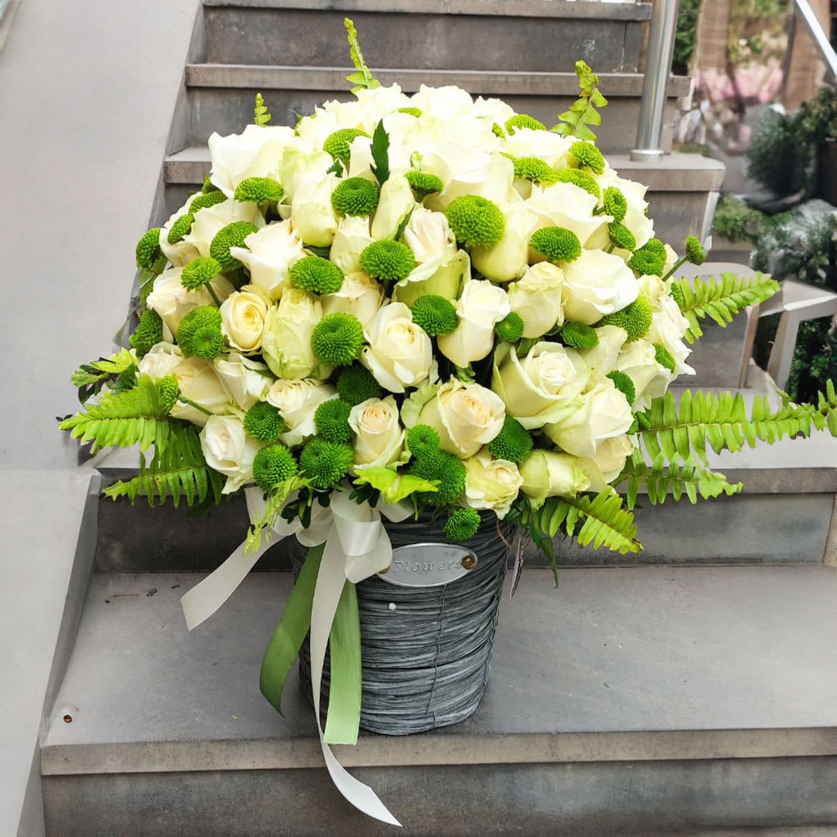 Эта изысканная композиция сочетает в себе белоснежные одноголовые розы и яркие зеленые кустовые хризантемы, создавая атмосферу свежести и гармонии. Упаковано в необычное ведерко с цветами, что подчеркивает её элегантность. Возможны альтернативы оформления: корзина из лозы или с тканевой отделкой. Прекрасный выбор для поздравления на годовщину или для любимой.
